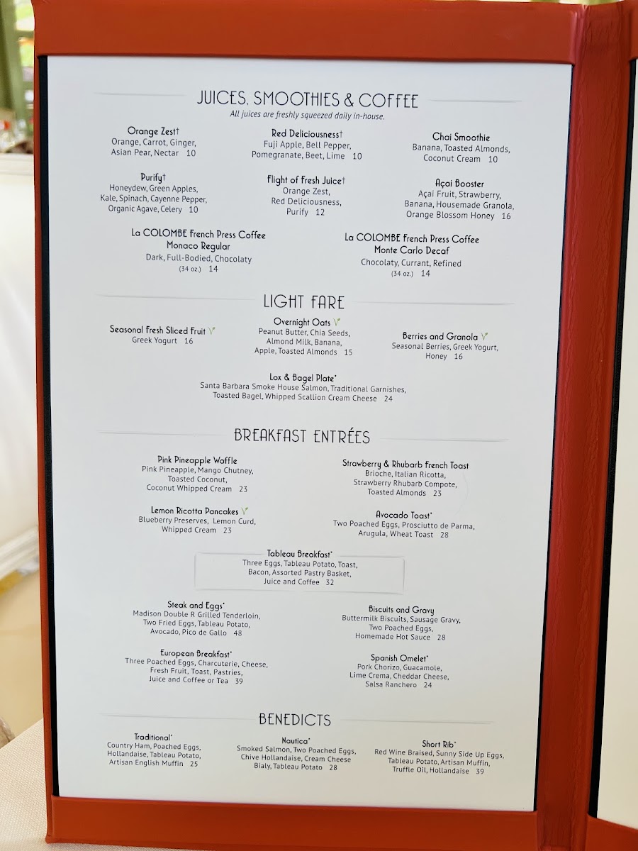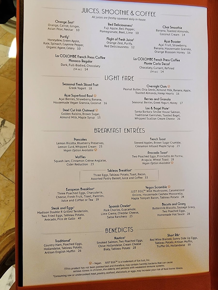 Tableau specializes in classic brunch fare with a creative twist, drawing attention to their breakfast entrées that are sure to titillate your taste buds. Consider trying the Pancakes with Lemon Ricotta, which are decadently paired with blueberry preserves and whipped cream for a sweet touch, or opt for the Avocado Toast, adorned with two poached eggs, argyle arugula, and prosciutto de Parma – it’s a brunch item that promises to deliver both style and substance. For something sweeter, the French Toast with stewed apples, brown sugar crumble, and a drizzle of cinnamon-infused maple syrup is an absolute must-try, perfect for those with a penchant for all things indulgent.